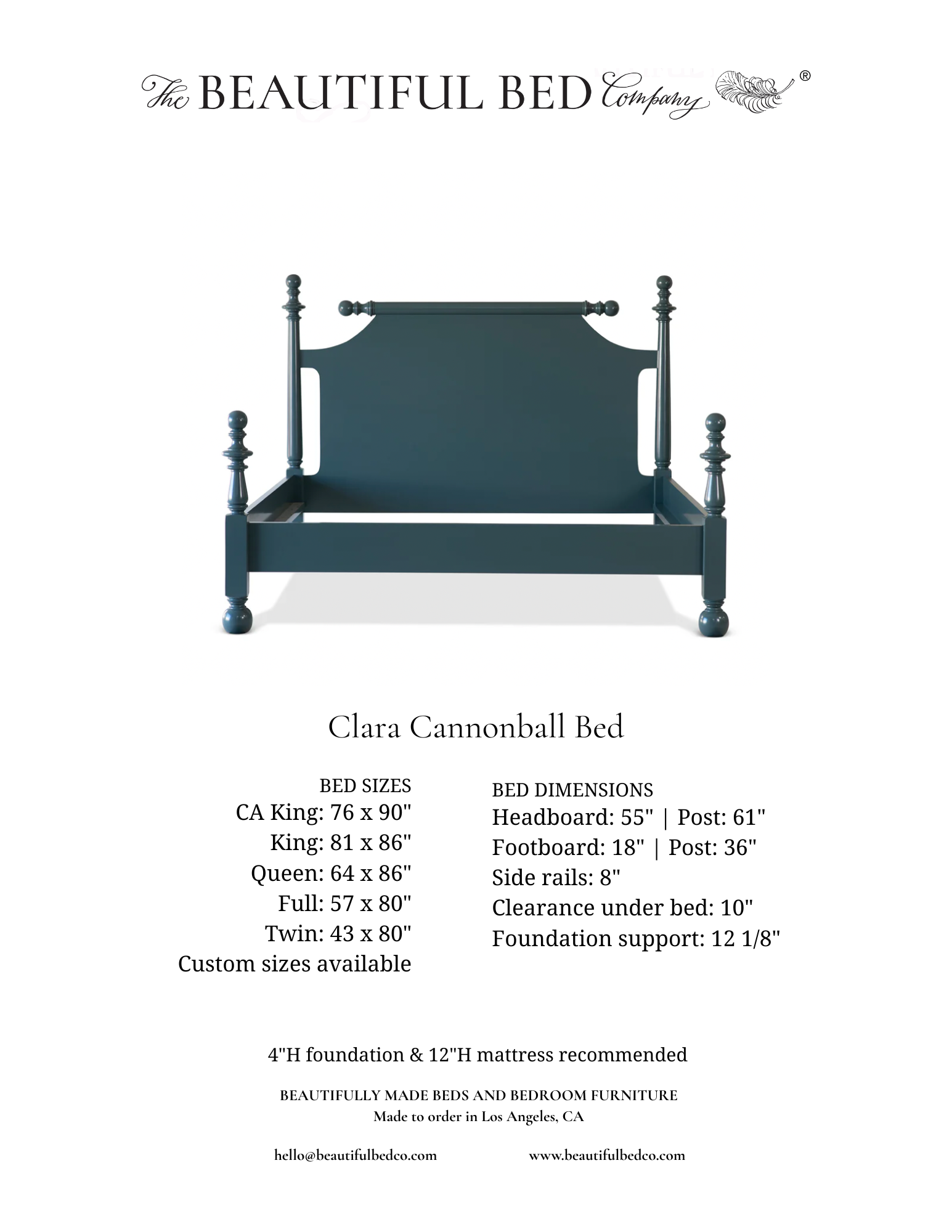 The Clara Cannonball Bed from The Beautiful Bed Company is simply classic. This bed sits on darling ball turned legs with beautiful finial details. This solid wood, yet feminine looking bed would look at home in a traditional farmhouse or a cottage mountain escape. This piece is timeless in its charming design. Finish in a traditional color or wood stain or give this piece a contemporary twist by adding a custom color in our lacquer finish.