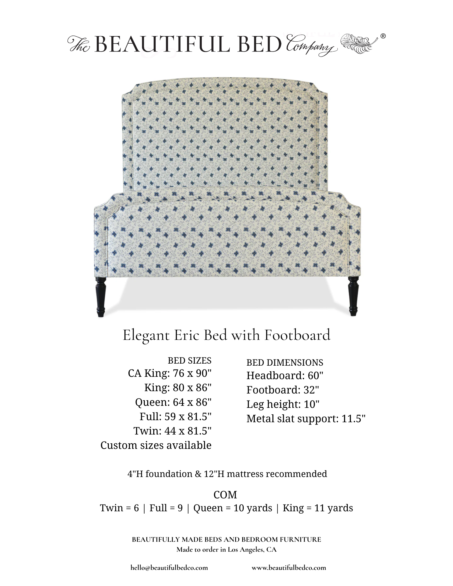 Our beautiful Elegant Eric Bed with Footboard is just that, simply elegant. The simple arched style headboard is both timeless and modern, with double welting and subtle cut out corners. This version has a high footboard matching the headboard for a more traditional option. Choose any fabric in the world to make this pieces as unique and custom as you'd like for your special room. Choose contrast welting for more border detail or can also be welted in the same headboard fabric for more simplicity.