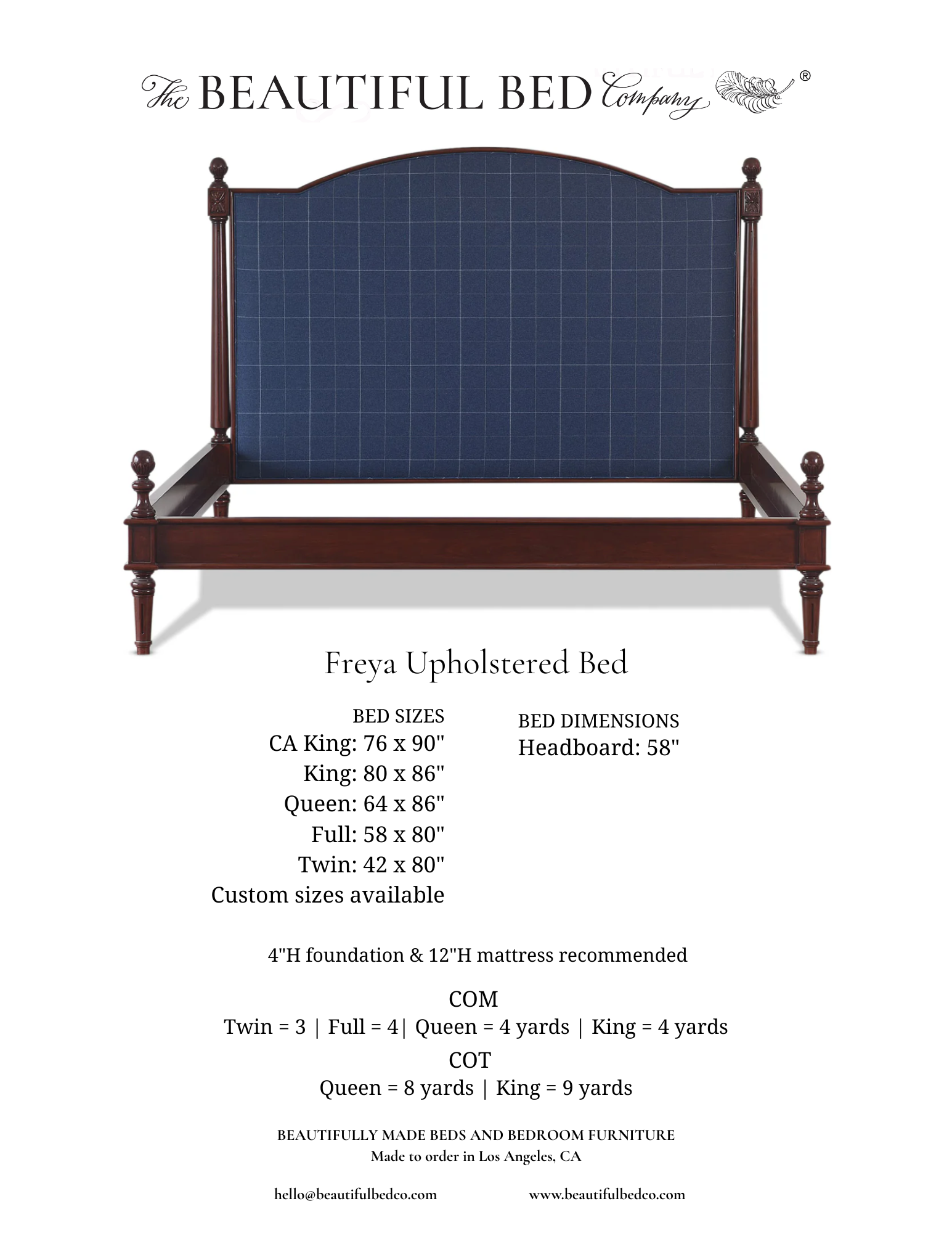 The Freya Upholstered Bed by The Beautiful Bed Company is French elegance itself. Beautiful hand carved posts adorn all four corners of the bed. Each post is finished with delicate acorn style hand carved finials. See also our Freya Upholstered Bed with Footboard for a true classic style. Finish in a traditional color or wood stain or give this piece a contemporary twist by adding a custom color in our lacquer finish that compliments any fabric of your choosing.