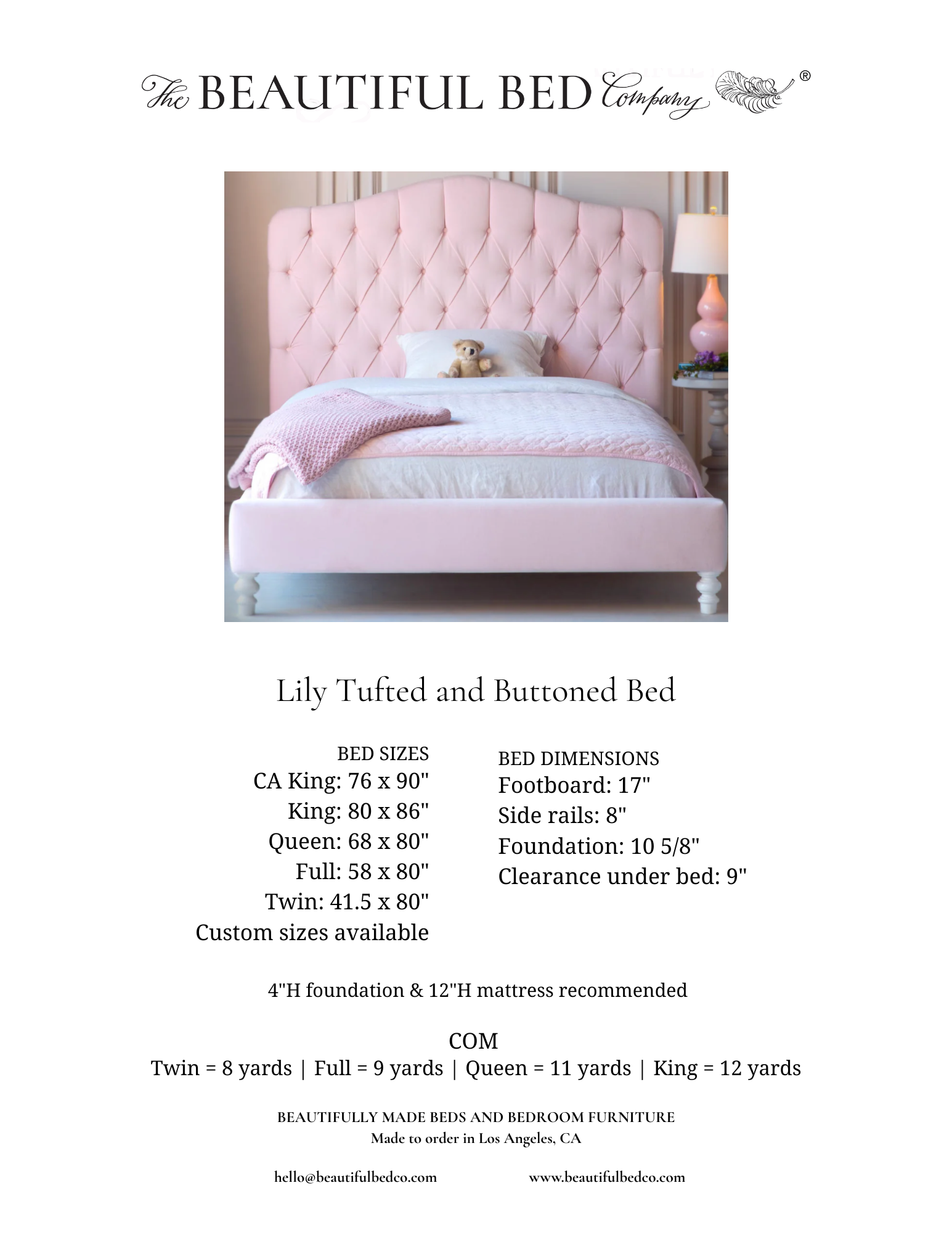 Our Lily Tufted and Buttoned Bed features a classic camel back headboard. Charming turned solid wood legs and richly padded headboard, footboard and side rails make this bed extra luxurious. The headboard can be button tufted for a more traditional look. Send us any COM fabric of your choosing as well as contrast piping if desired.