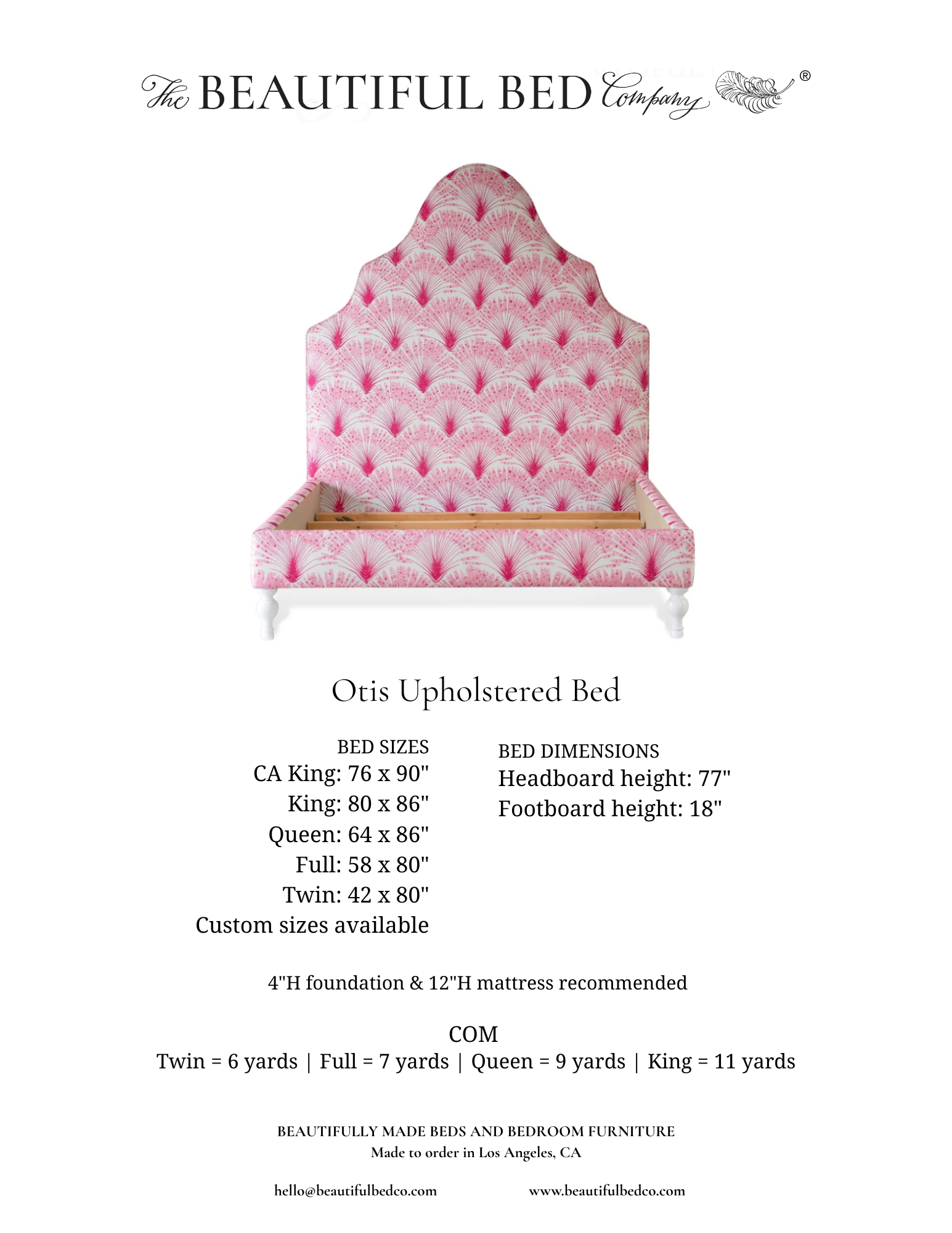 The Otis Upholstered Bed is a classic waterfall shaped headboard with its gentle, undulating silhouette. The headboard is luxuriously upholstered and the richly padded footboard and side rails make this bed extra luxurious. Send us any COM fabric of your choosing as well as contrast piping if desired.