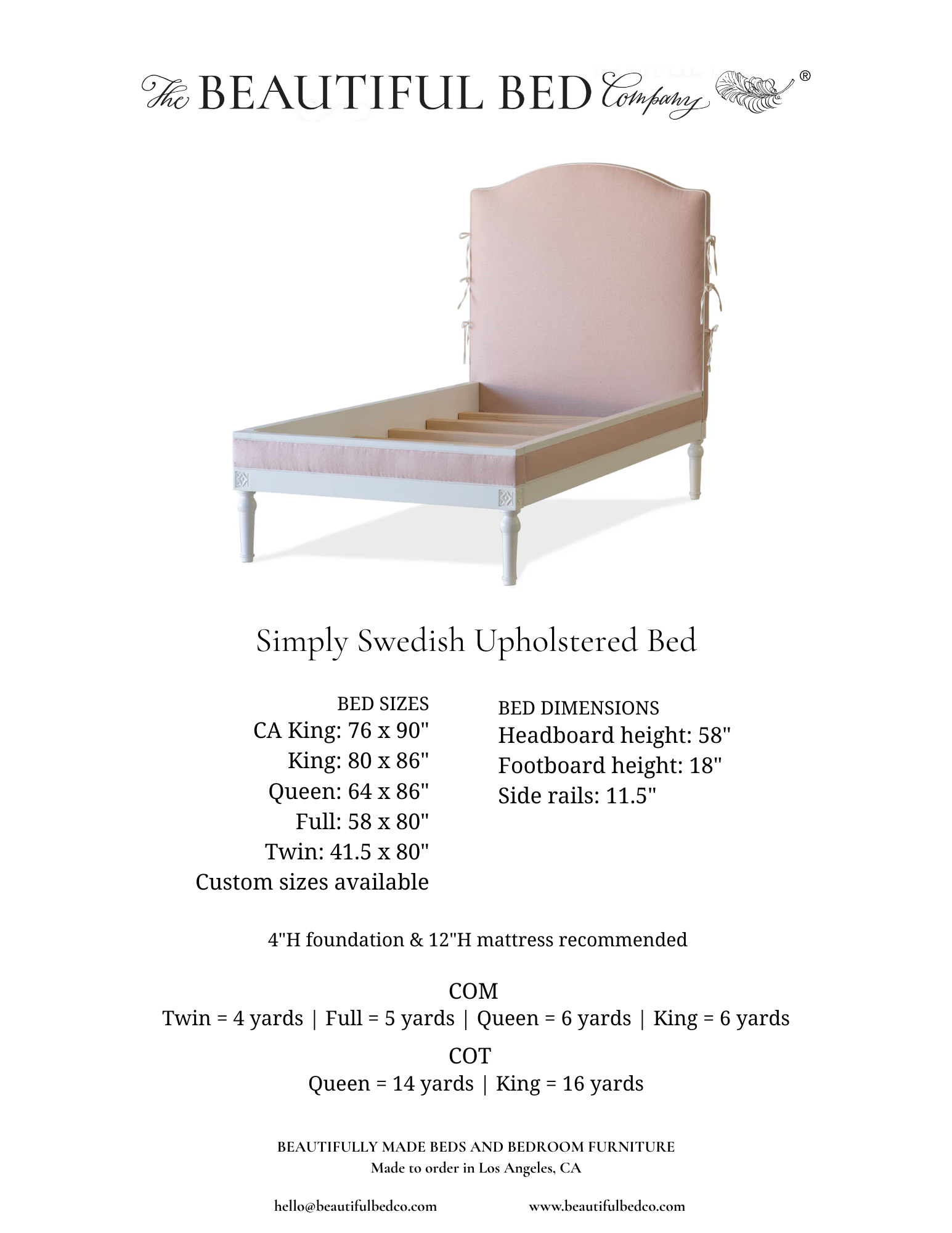 The Simply Swedish Upholstered Bed offers a casual beauty with its hand carved detailing on the legs and simple, clean lines. As one of many pieces in our Simply Swedish Collection, this style boasts beautiful wood and fabric detailing and is a classic in any bedroom. This bed can be ordered with or without bows.