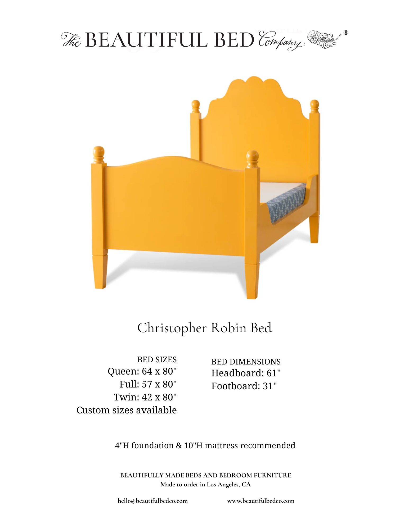 Christopher Robin Bed from The Beautiful Bed Company was inspired by an old bed found in an English farmhouse. The headboard and footboard boast beautiful custom curves and atop each post a rounded bed knob. A charming piece in bold colors or in all natural wood.