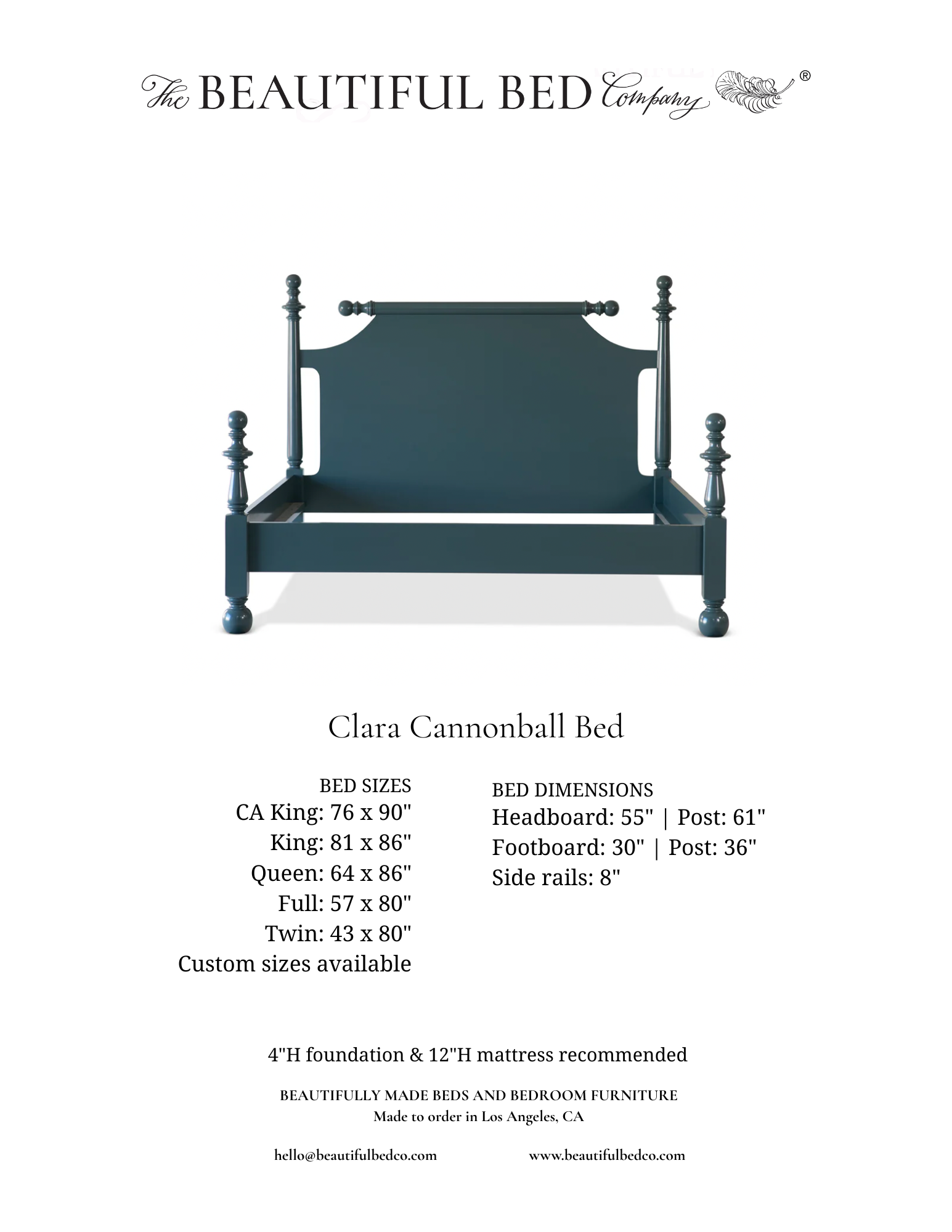 The Clara Cannonball Bed from The Beautiful Bed Company is simply classic. This bed sits on darling ball turned legs with beautiful finial details. This solid wood, yet feminine looking bed would look at home in a traditional farmhouse or a cottage mountain escape. This piece is timeless in its charming design. Finish in a traditional color or wood stain or give this piece a contemporary twist by adding a custom color in our lacquer finish.