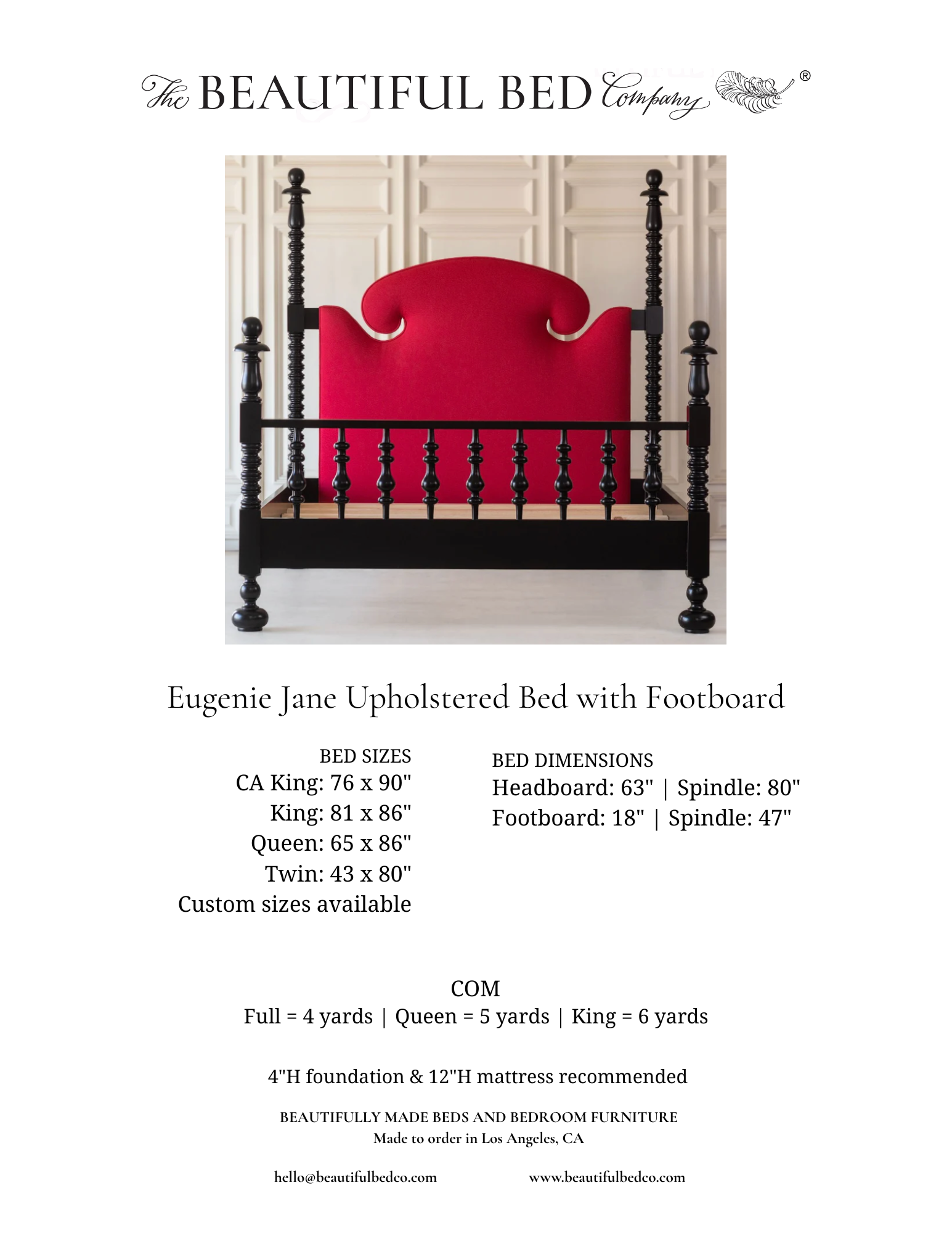 The Eugenie Jane Upholstered Bed with Footboard from The Beautiful Bed Company is simply WOW. This piece pays homage to American craftsmanship and peaks its cap to modern, farmhouse furniture. Each spindle is intricately turned by hand by our own artisans. Choose any fabric and paint or stain of your choice to further enhance the uniqueness and customization of your style. The Eugenie in a bright, fresh lacquer color makes this piece feel vibrant and contemporary with a traditional twist. See also our all wood version for a slightly more masculine option.