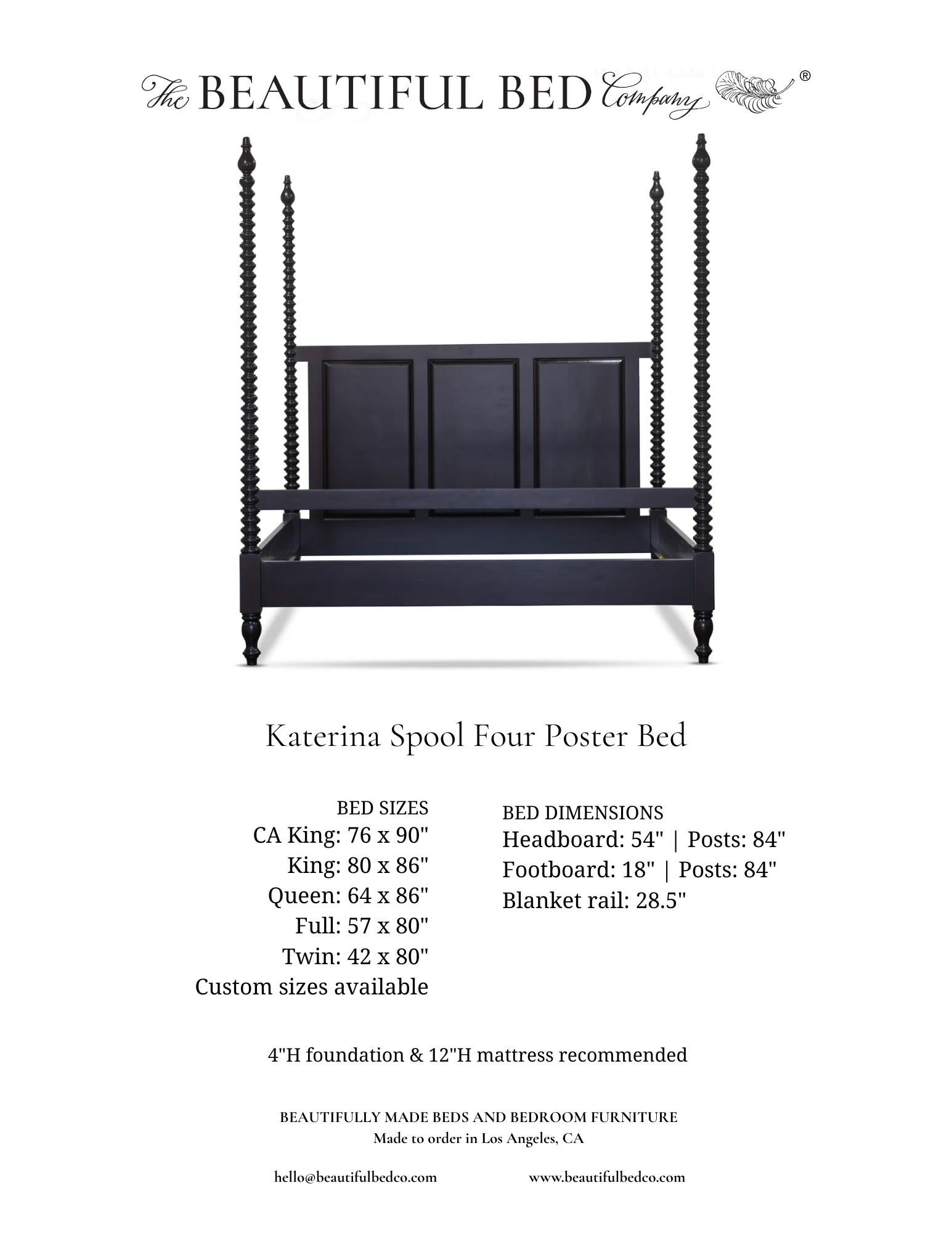 The Katerina Spool Four Poster Bed was designed after the success of our Grand St Andrews Barley Twist Canopy Bed. It boasts four spool turned wood posts that each support a hand carved finial. This bed adds drama and dimension to any bedroom and makes a bold statement of designer style. This bed is a showcase of our American craftsmanship. All our Canopy Beds are made as a complete solid piece, a complete headboard and a complete Footboard. The side rails are separate pieces.The customer has responsibility to ensure all the separate pieces, including the complete headboard and footboard fit through the openings and doorways in their home.