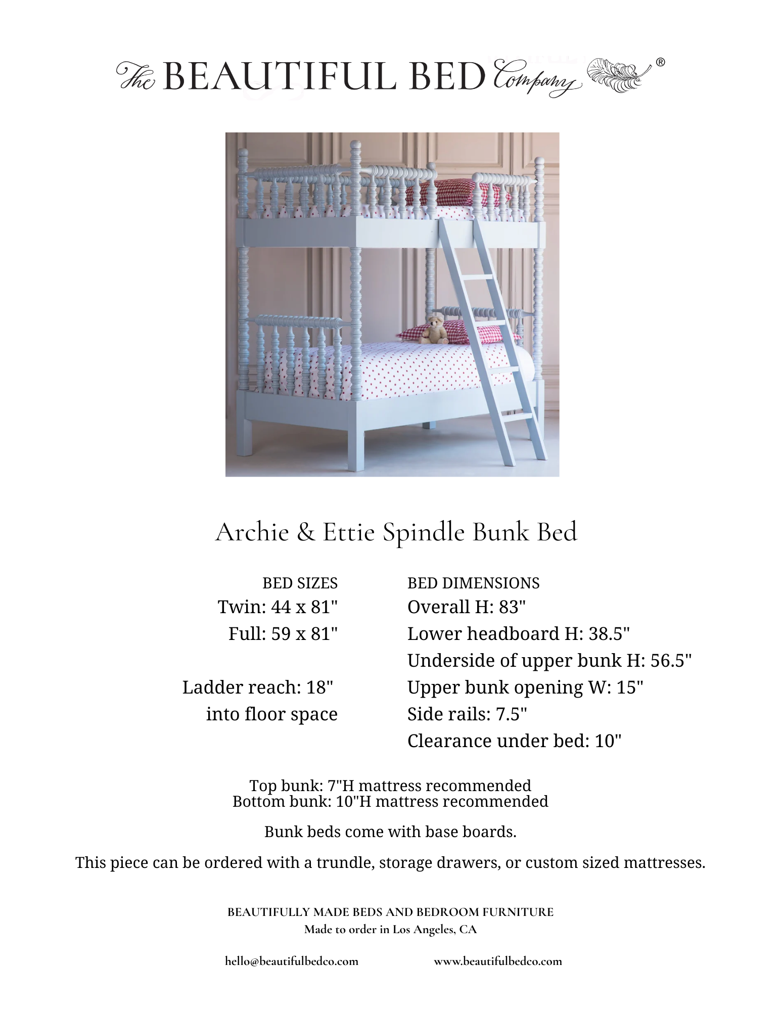 The Archie & Ettie Bunk is built as a Twin over Twin or Twin over Full and can be customized upon request. Ladder location and style can also be customized. Add on any of our trundle styles as well for an extra mattress (for those little one's precious sleep overs!) or for extra storage.