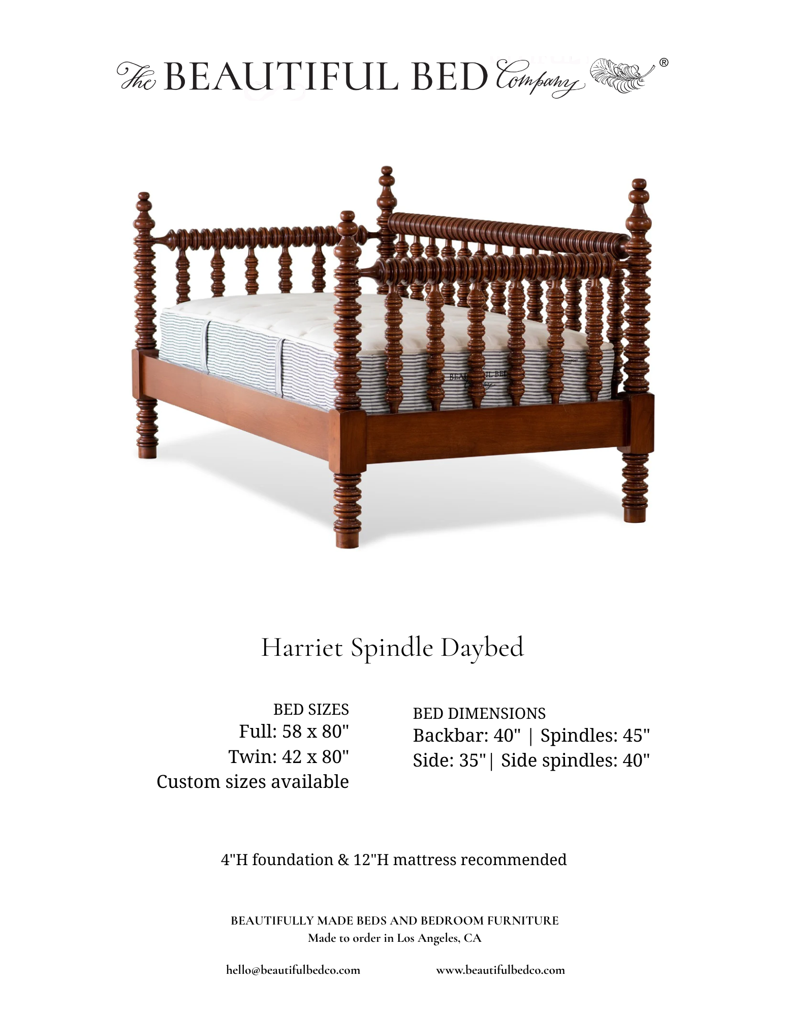 If properly cared for, your furniture from The Beautiful Bed Company should become a family heirloom passed down through generations. Solid wood is a natural material, and therefore will shrink and swell with the seasons. Be careful not to expose your furniture to extremes in temperature or humidity, and avoid exposure to direct sunlight or heat sources.