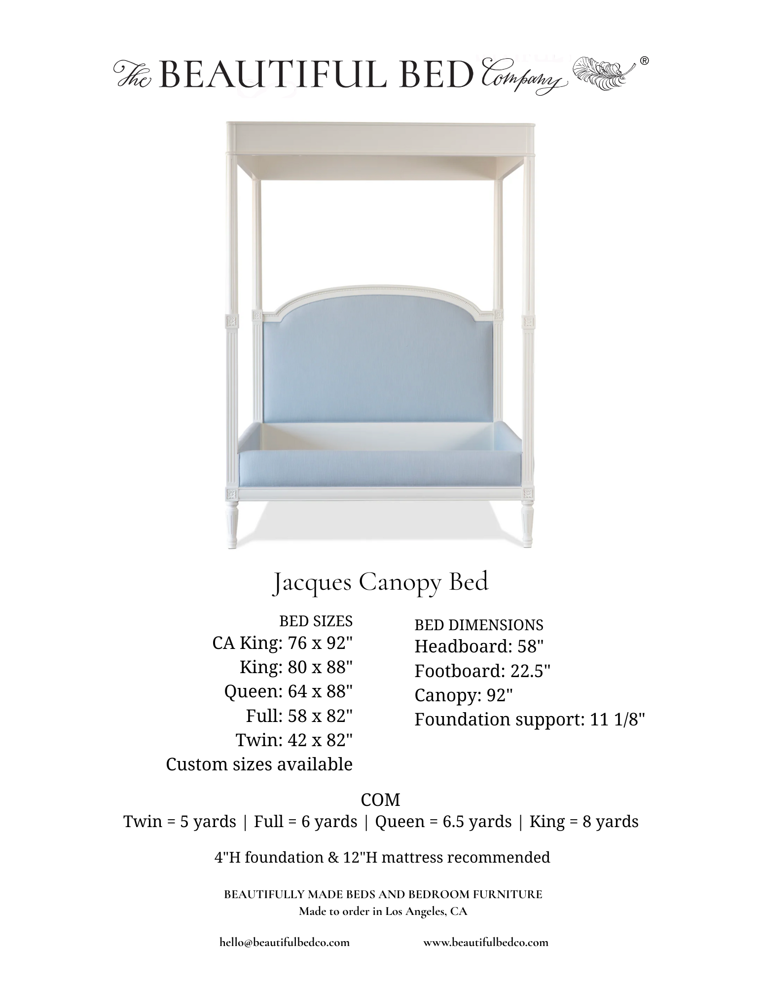 The Jacques Canopy Bed is a Louis XVI-inspired bed with a slimmed down Neoclassical design. Admire the beauty of the upholstered headboard, siderails and foot rail in combination with the carved wood posts and canopy top.