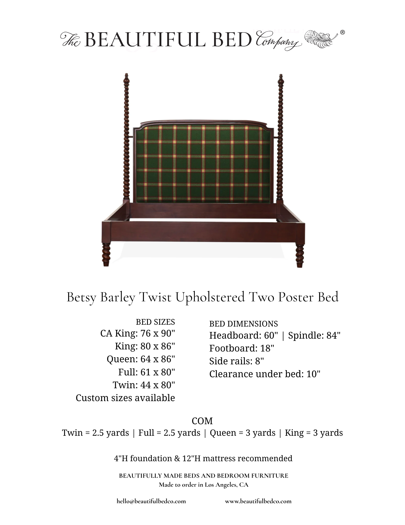 The Betsy Barley Twist Upholstered Poster Bed by The Beautiful Bed Company keeps the classic feel of the four poster, but slimmed down with only two headboard posts. Choose any fabric and paint or stain of your choice to further enhance the uniqueness and customization of this beautiful style. Our Betsy in a bright, fresh lacquer color makes this piece feel vibrant and contemporary with a traditional twist.