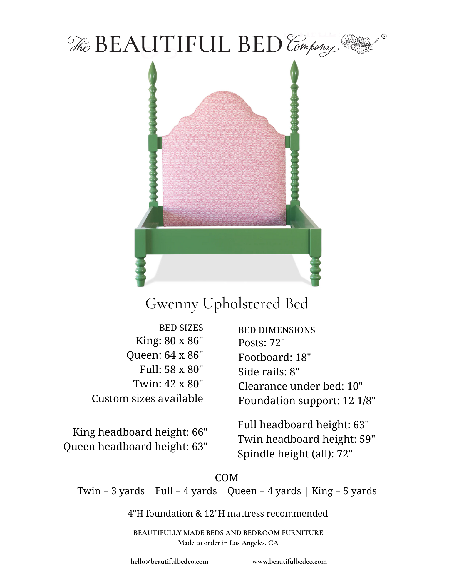 The Gwenny Upholstered Spindle Bed from The Beautiful Bed Company is the big sister of our hugely popular Gwenny Upholstered Four Poster Bed. Both beds are a real statement piece. Admire the 2 hand carved spool spindles and the graceful arched headboard. All made by our talented artisans in California. This bed lends itself to many interior design styles, equally brilliant in either a New York loft apartment, a rural farmhouse or a coastal cottage. The spool design of this bed is timeless. Be sure to visit our other beautiful pieces in our Gwenny Collection.