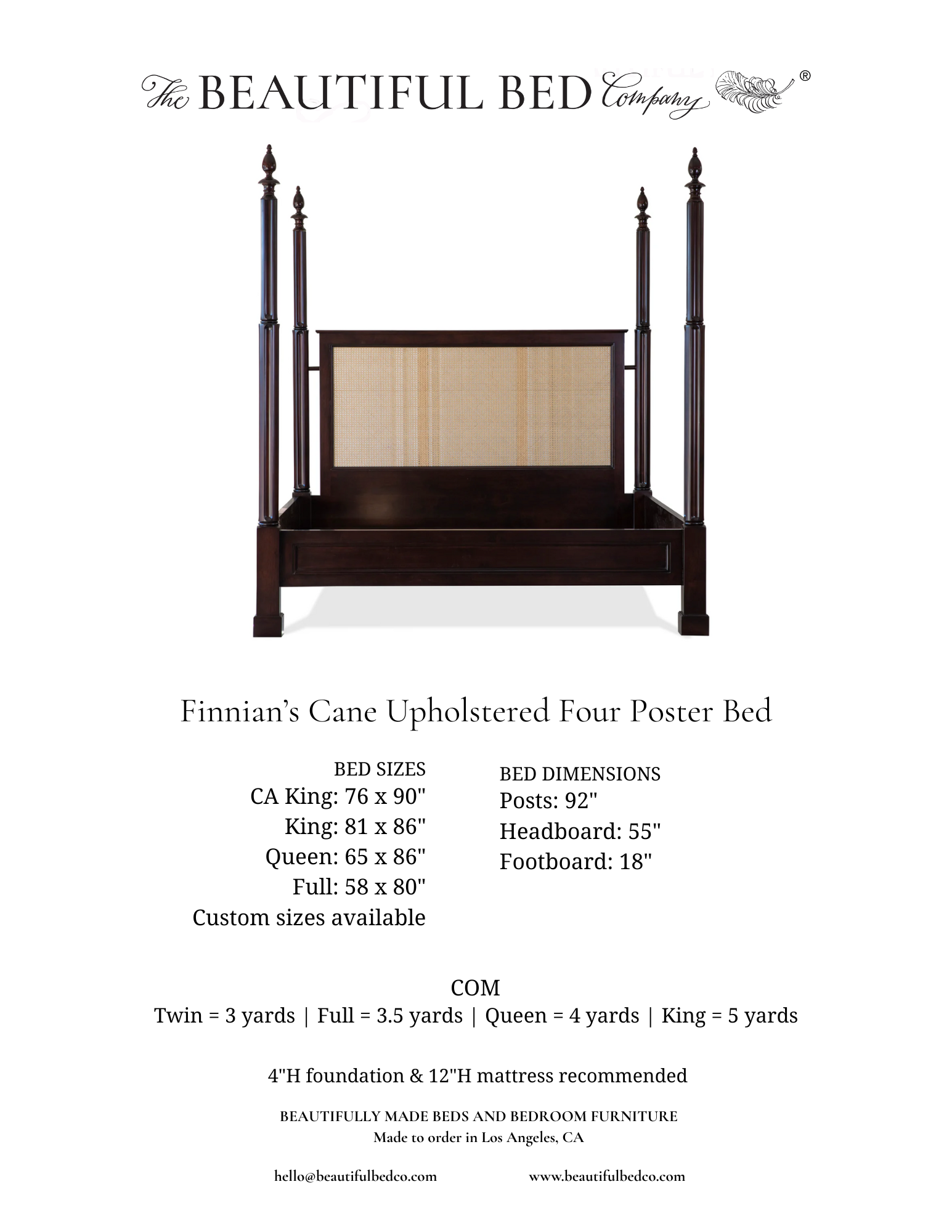 The Finnian's Cane Four Poster Bed from The Beautiful Bed Company offers a stunning and sophisticated focal point in any bedroom. This unique design made from solid wood, boasts four, tall carved posts with pointed finials for extra eye catching detail. Finish in a traditional color or wood stain, or give this piece a contemporary twist by adding fresh custom color in our lacquer finish. Also comes in an all wood version.