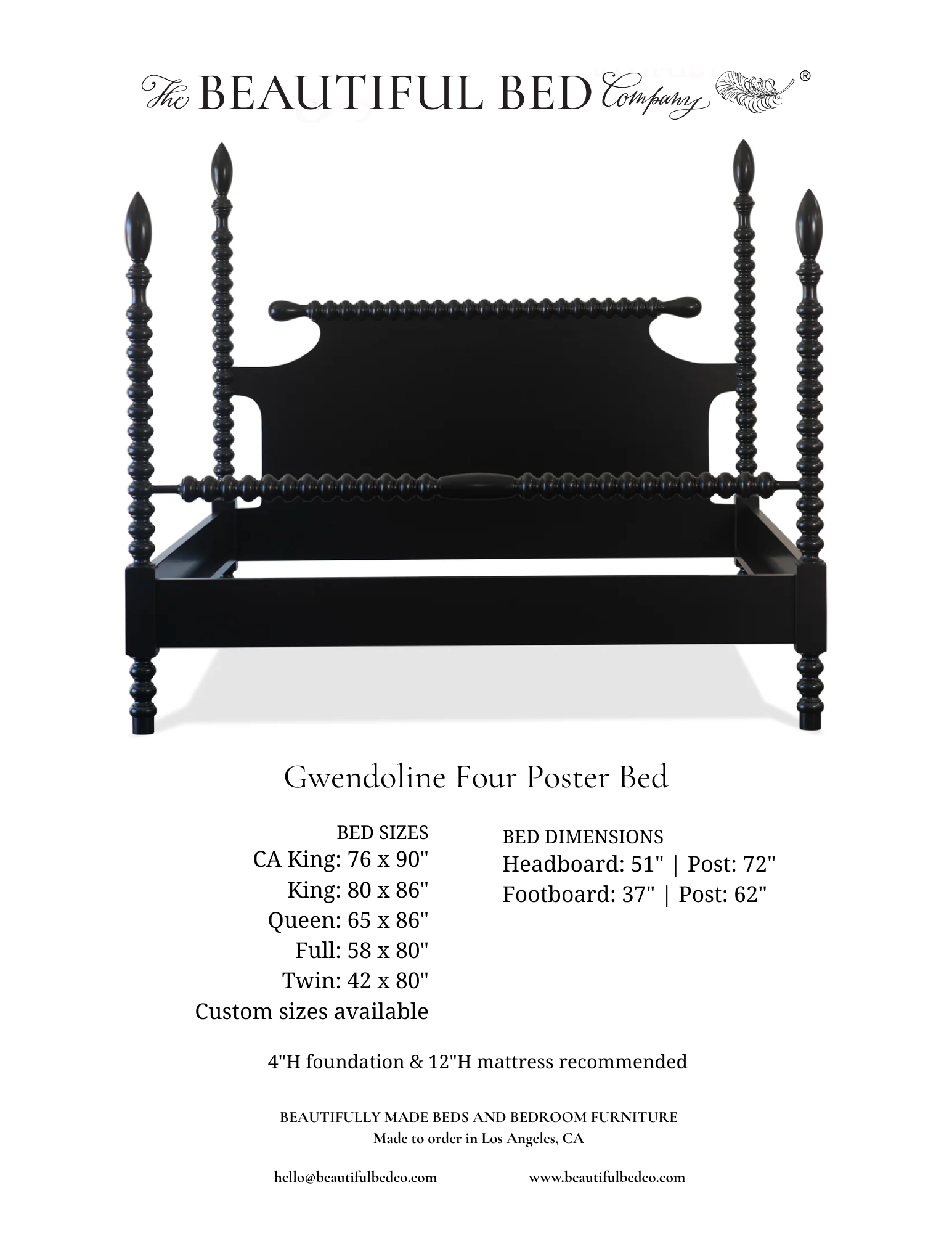 The Gwendoline Spindle Bed from The Beautiful bed Company is one of the best selling beds in America. Admire the four hand carved spool spindle posts, the spindle blanket rail and the spindle adorned headboard. All made by our talented artisans in California. This bed lends itself to many interior design styles, looking equally stunning in a New York loft apartment, rural farmhouse or a coastal cottage. Choose a vibrant custom color for a more modern, eye catching gem.