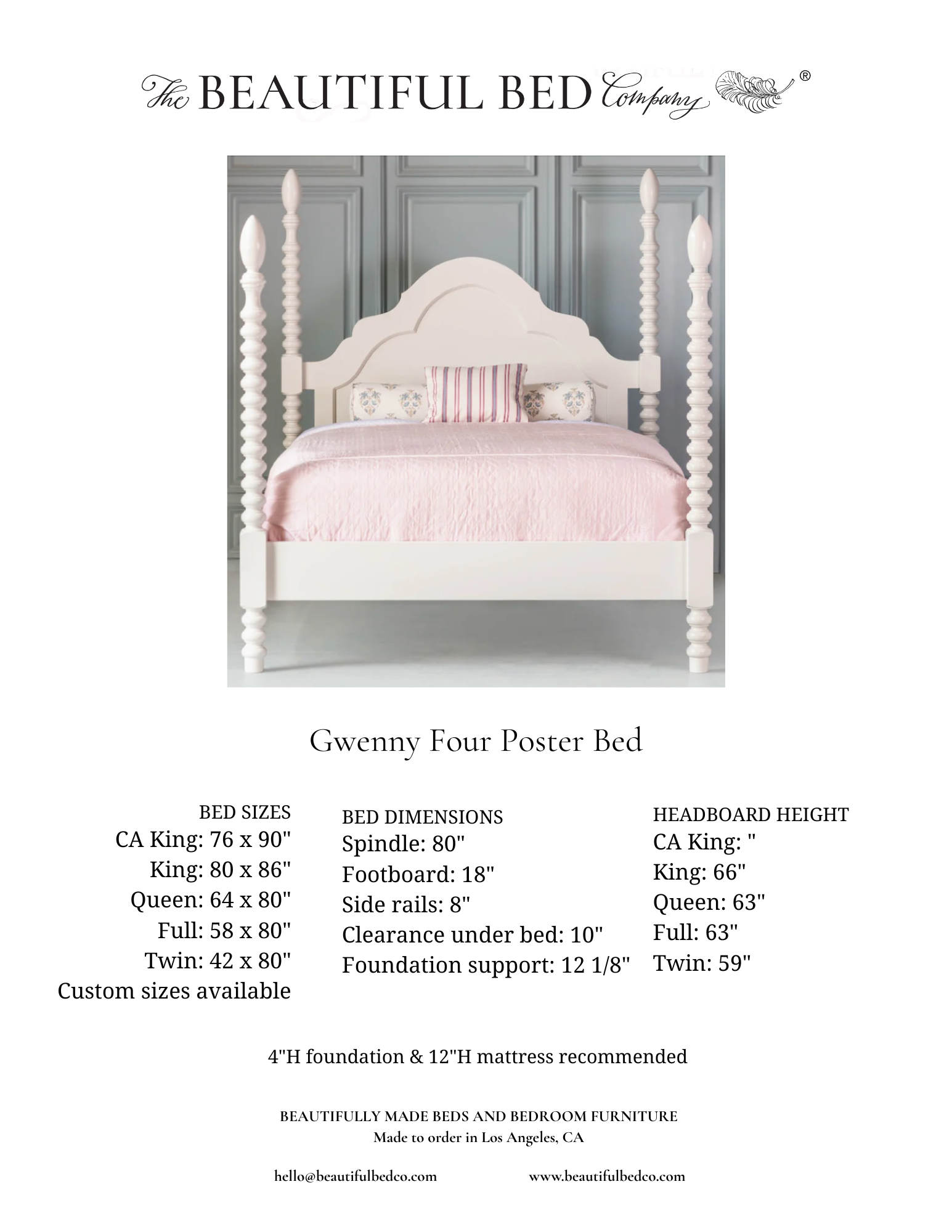 The Gwenny Four Poster Bed from The Beautiful Bed Company is the little sister of our hugely popular Gwendoline Bed. Both beds are a real statement piece. Admire the 4 hand carved spool spindles and the graceful arched headboard. All made by our talented artisans in California. This bed lends itself to many interior design styles, equally brilliant in either a New York loft apartment, a rural farmhouse or a coastal cottage. The spool design of this bed is timeless. Be sure to visit our other beautiful pieces in our Gwenny Collection