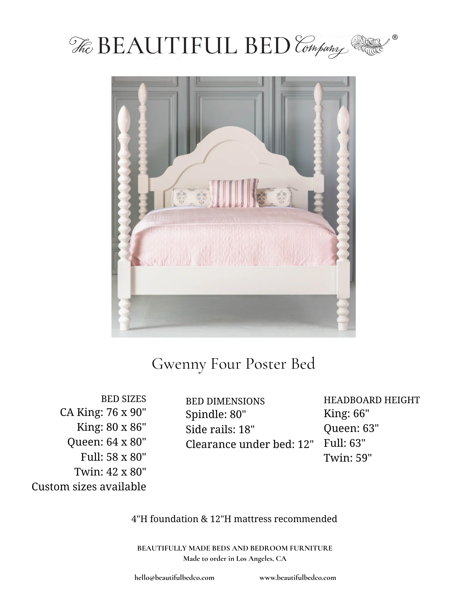 The Gwenny Four Poster Bed from The Beautiful Bed Company is the little sister of our hugely popular Gwendoline Bed. Both beds are a real statement piece. Admire the 4 hand carved spool spindles and the graceful arched headboard. All made by our talented artisans in California. This bed lends itself to many interior design styles, equally brilliant in either a New York loft apartment, a rural farmhouse or a coastal cottage. The spool design of this bed is timeless. Be sure to visit our other beautiful pieces in our Gwenny Collection.