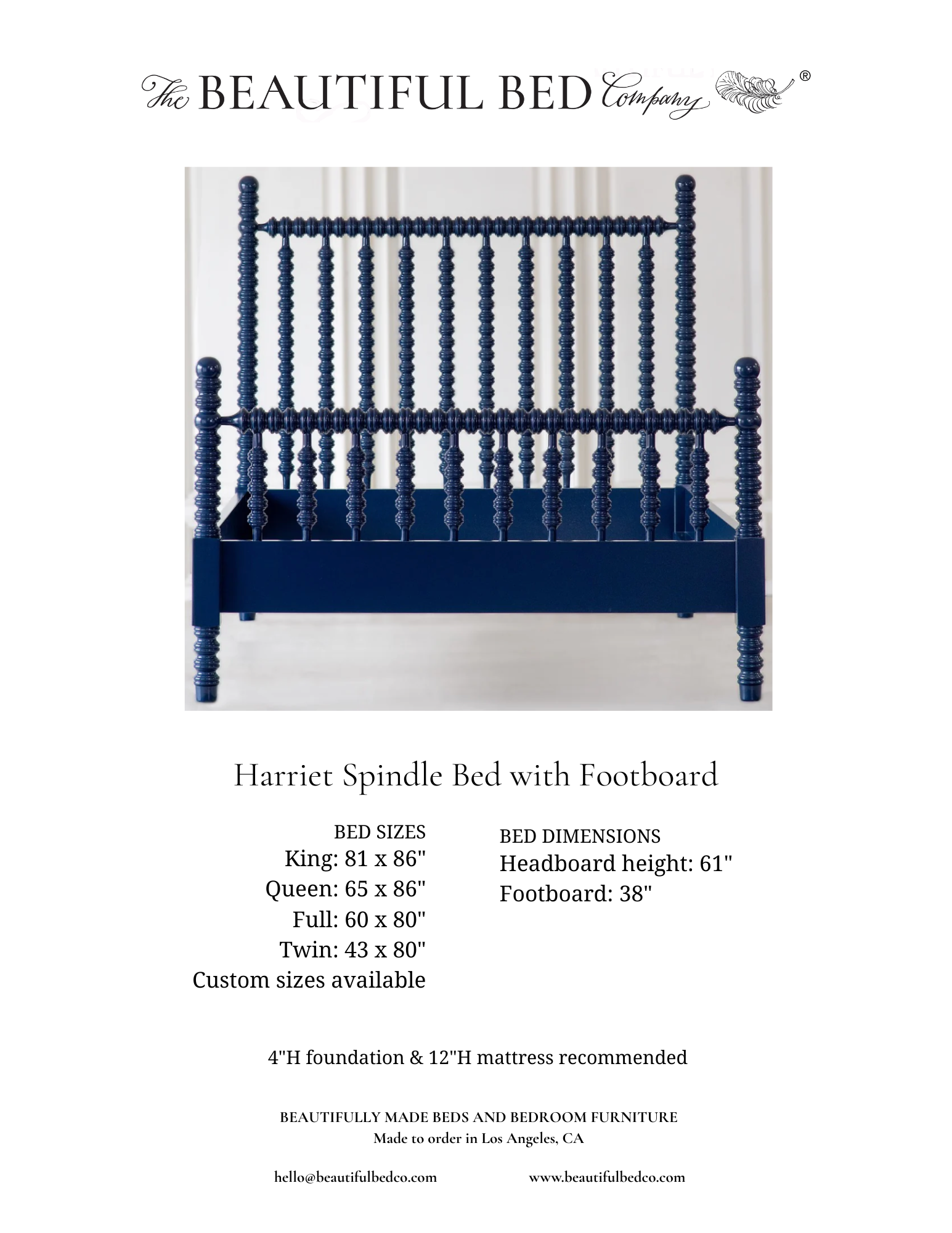 The Harriet Spindle Bed from The Beautiful Bed Company is one of our most beloved pieces. The classic, timeless spindles look stunning in any color or stain. Finish in a traditional color or wood stain or give this piece a contemporary twist by adding a fun custom color. See also our Harriett Spindle Bed with no Footboard for a slightly more simple offering.