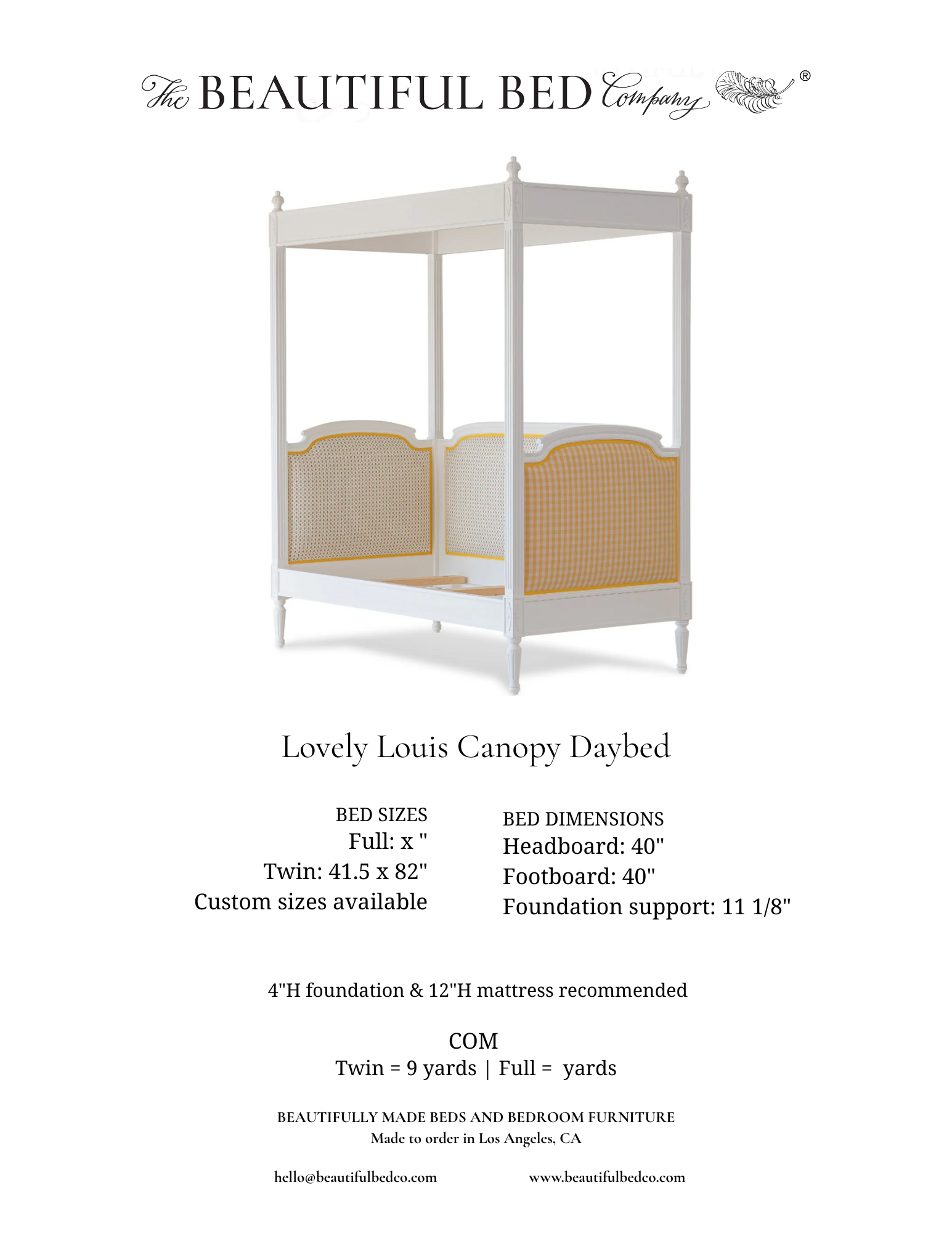 The Lovely Louis Canopy Daybed by The Beautiful Bed Company, is inspired by royalty. It is reminiscent of the French style and boasts an understated elegance. It offers a casual elegance with its naive hand carving and curved lines on both the headboard and footboard. It is finished with four pretty hand carved finials. This piece is offered as a bed and a headboard only and can be upholstered with COM.