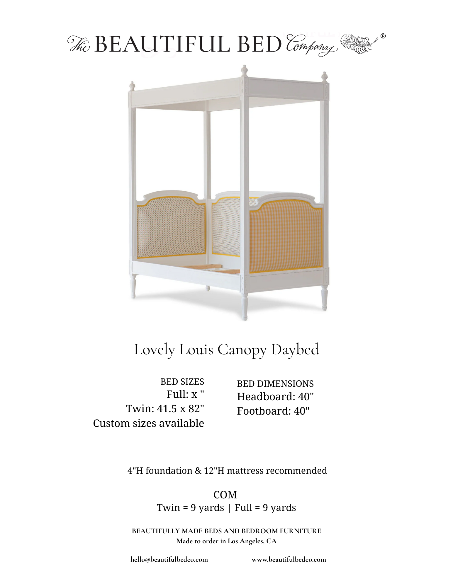 The Lovely Louis Canopy Daybed by The Beautiful Bed Company, is inspired by royalty. It is reminiscent of the French style and boasts an understated elegance. It offers a casual elegance with its naive hand carving and curved lines on both the headboard and footboard. It is finished with four pretty hand carved finials. This piece is offered as a bed and a headboard only and can be upholstered with COM.